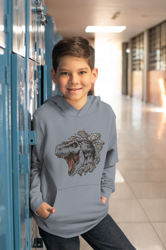 Cartoon Dinosaurier T-Rex Kopf bricht durch Wand - Hochwertiger Mittelschwerer Fleece-Hoodie für Jugendliche - Weltweit Verfügbar - GL