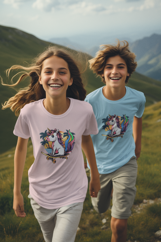 Einhorn Skater Sunset - Kinder T-Shirt Kurzarm-Shirt Baumwolle Hochwertig Langlebig - T-Shirt Kids BC SH