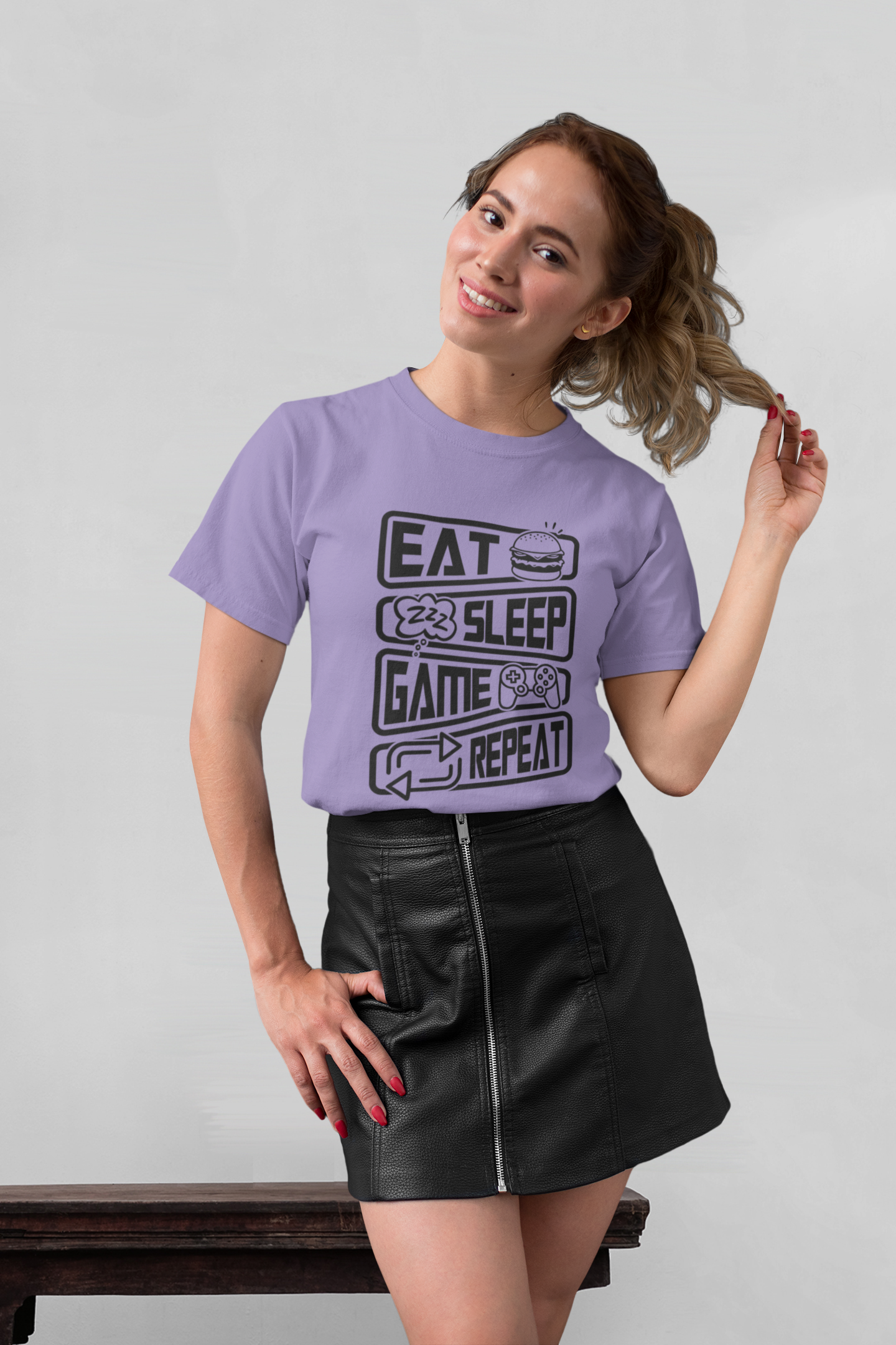 Unisex Erwachsenen Bio Baumwolle Kurzarm Shirt mit dem Design Eat Sleep Game Repeat Front.