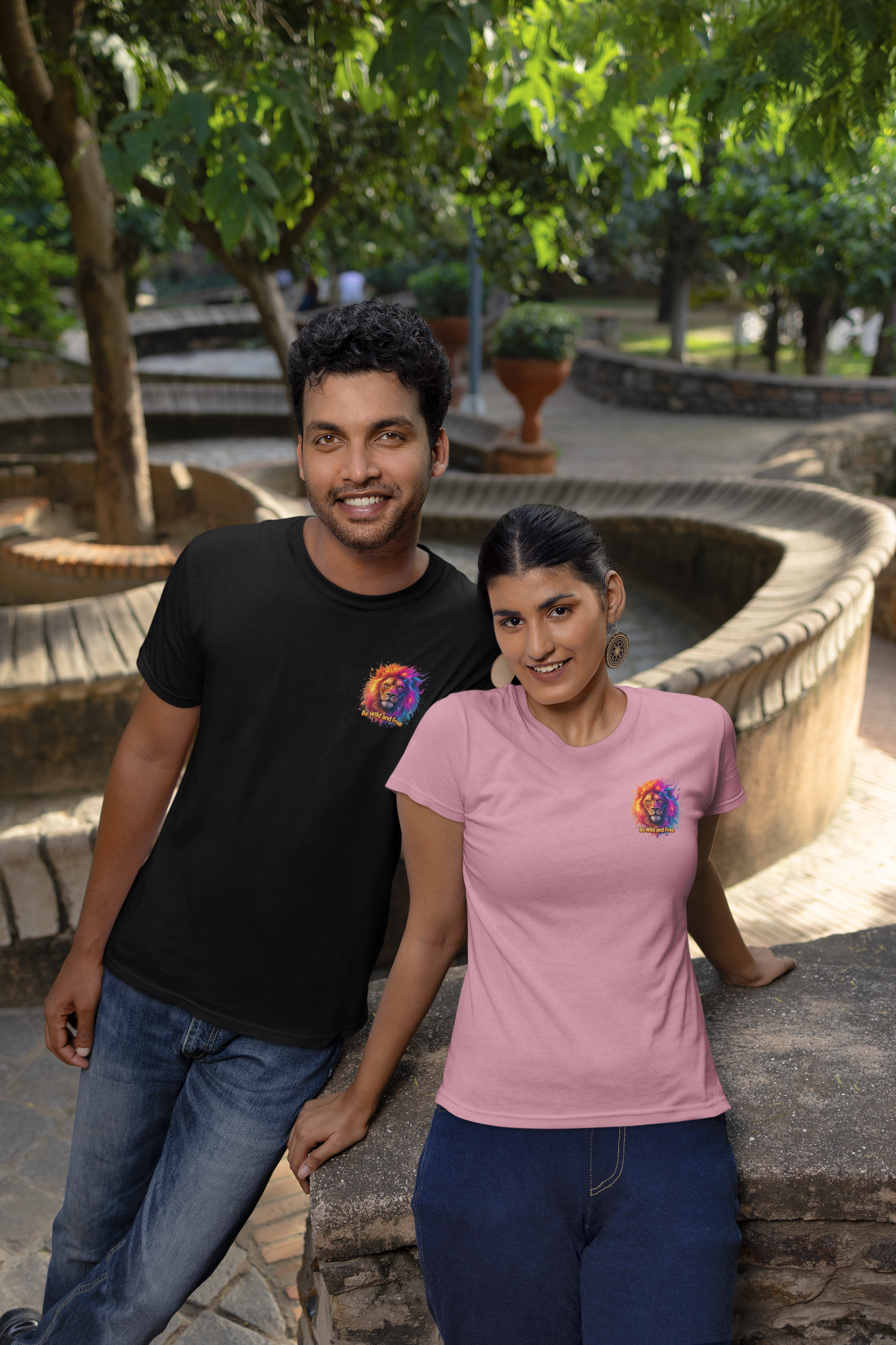 Unisex Erwachsenen Bio Baumwolle Kurzarm Shirt mit dem Design Löwe Be Wild and Free Galaxy.
