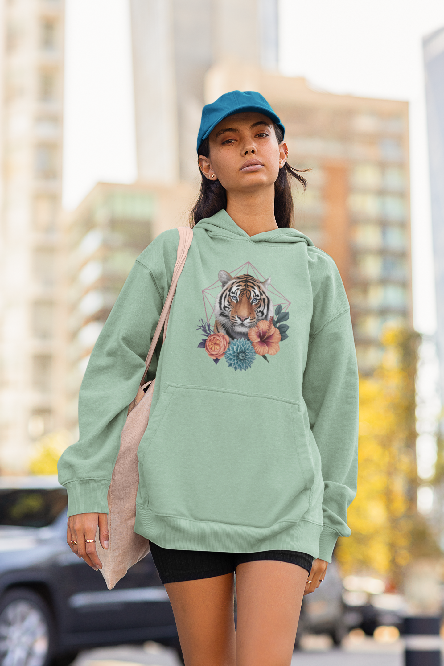 Unisex Oversized Hoodie Tiger Passion in Blumen Hexagon Front.