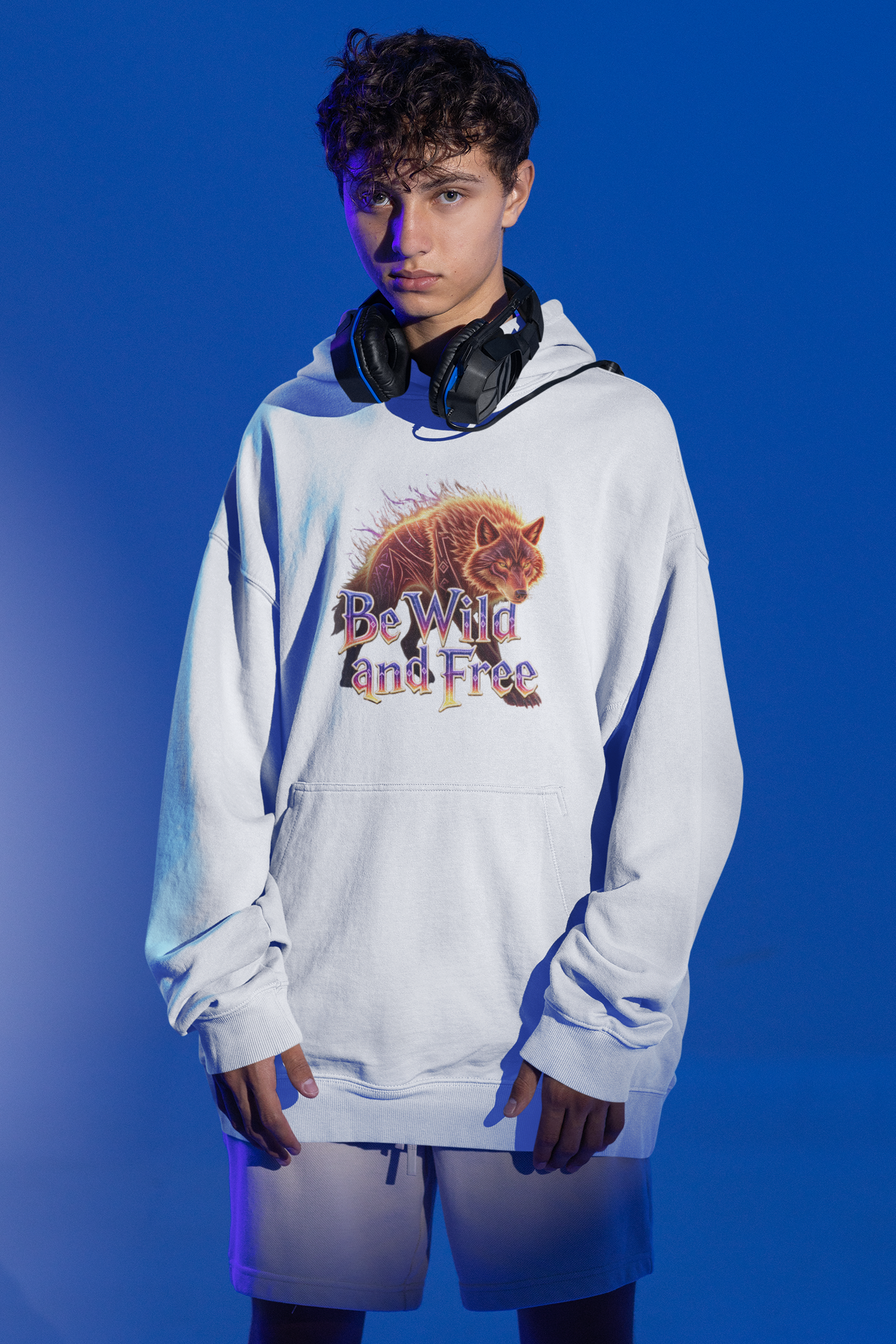 Unisex Oversized Hoodie Wilder Wolf in Flammen Be Wild and Free Front.