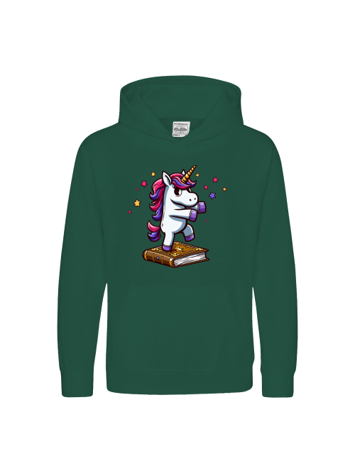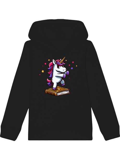 Sudadera con capucha premium para niños Dulce unicornio baila en un libro