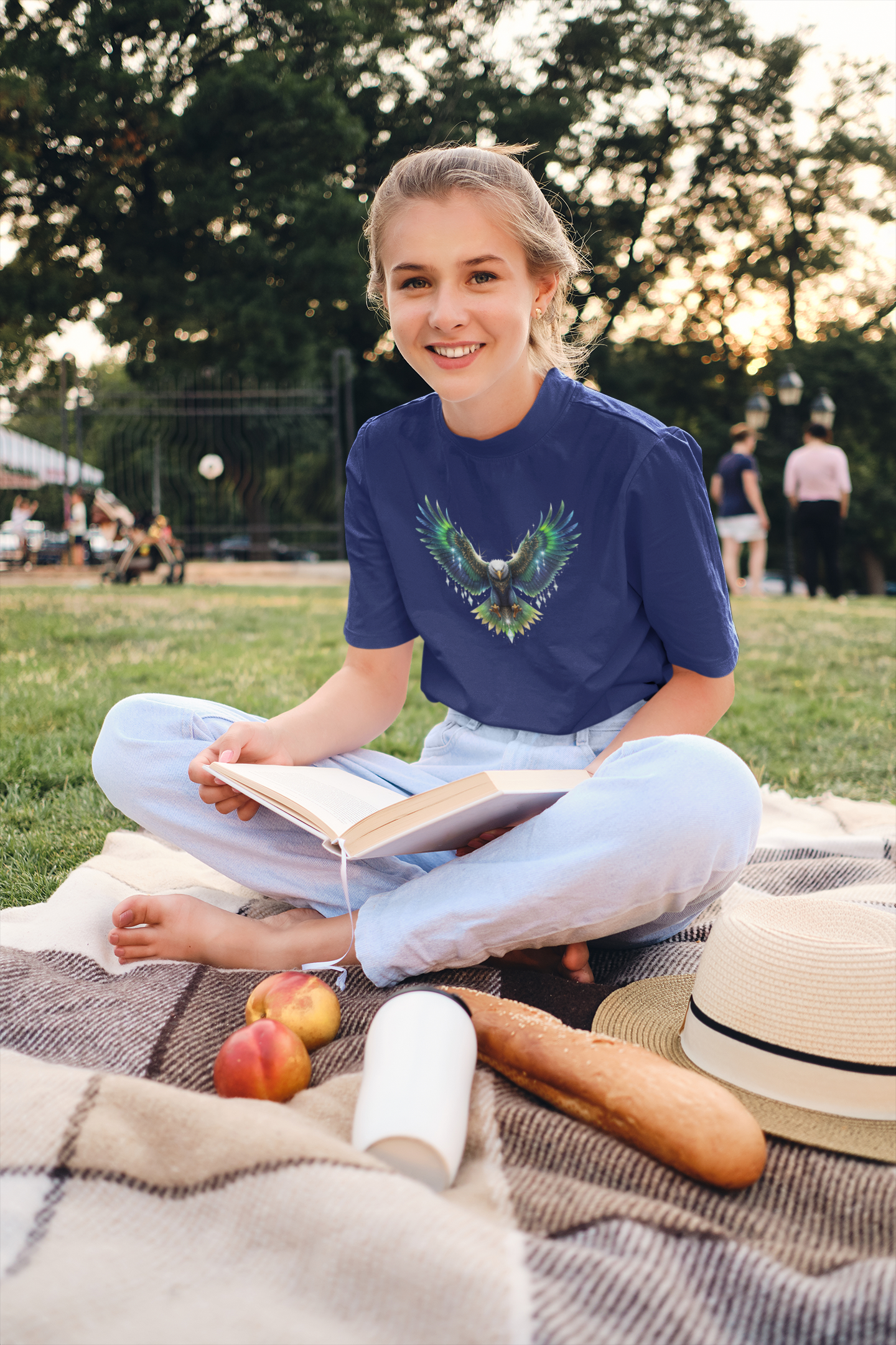 Unisex Erwachsenen Bio Baumwolle Kurzarm Shirt mit dem Design Diamanten Adler im Flug Front.