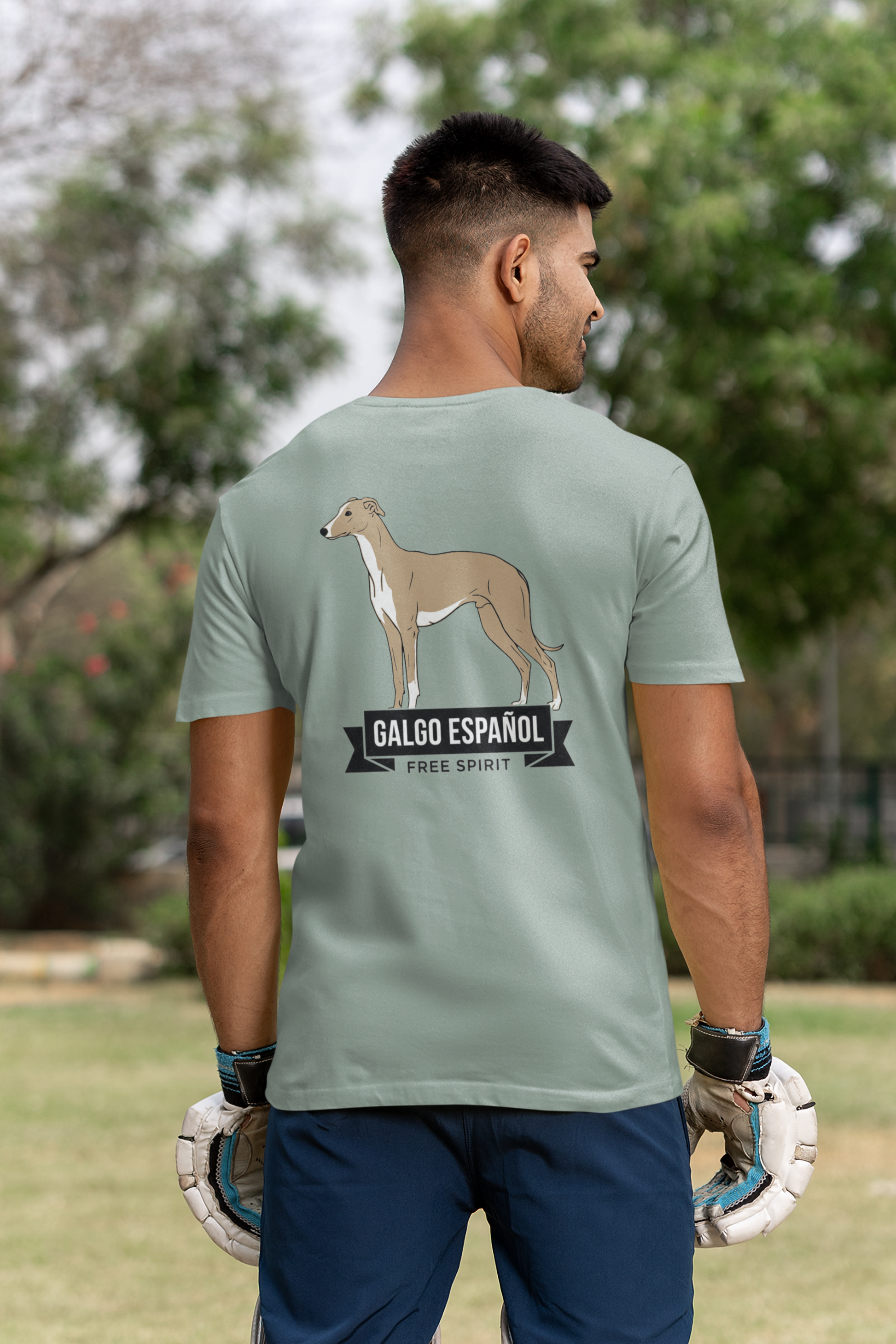 Unisex Erwachsenen Bio Baumwolle Kurzarm Shirt mit dem Design Wilder Galgo Espanol Free Spirit Backside.