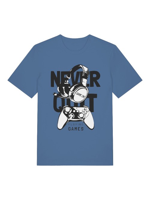 Unisex Erwachsenen Bio Baumwolle Kurzarm Shirt mit dem Design Never Quit Game on Playing Games Front.