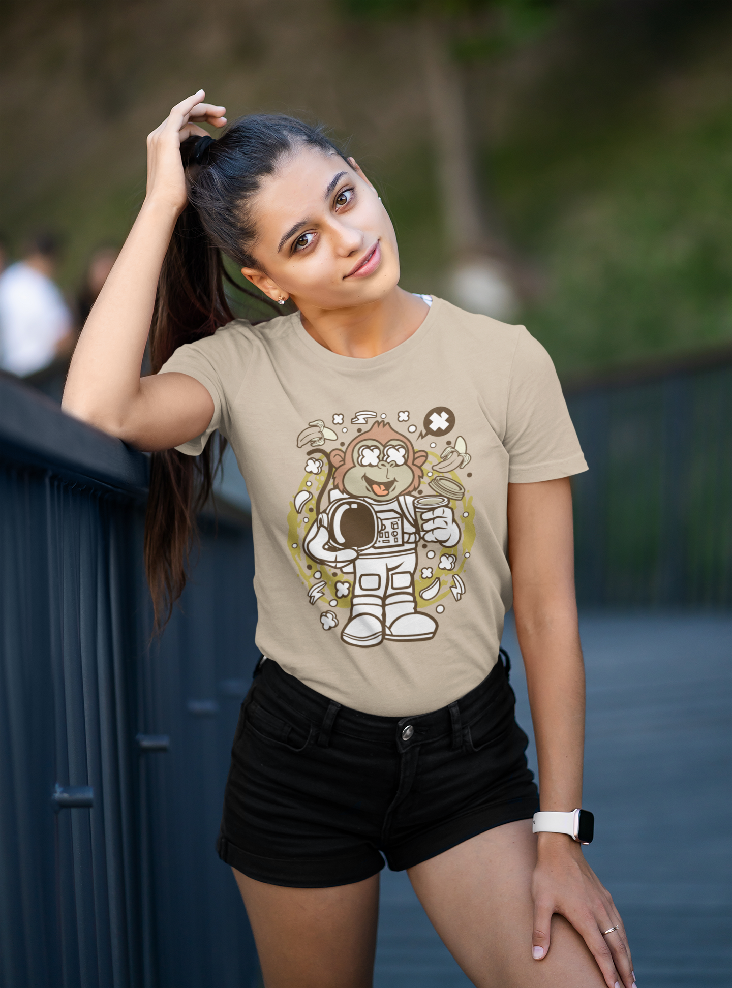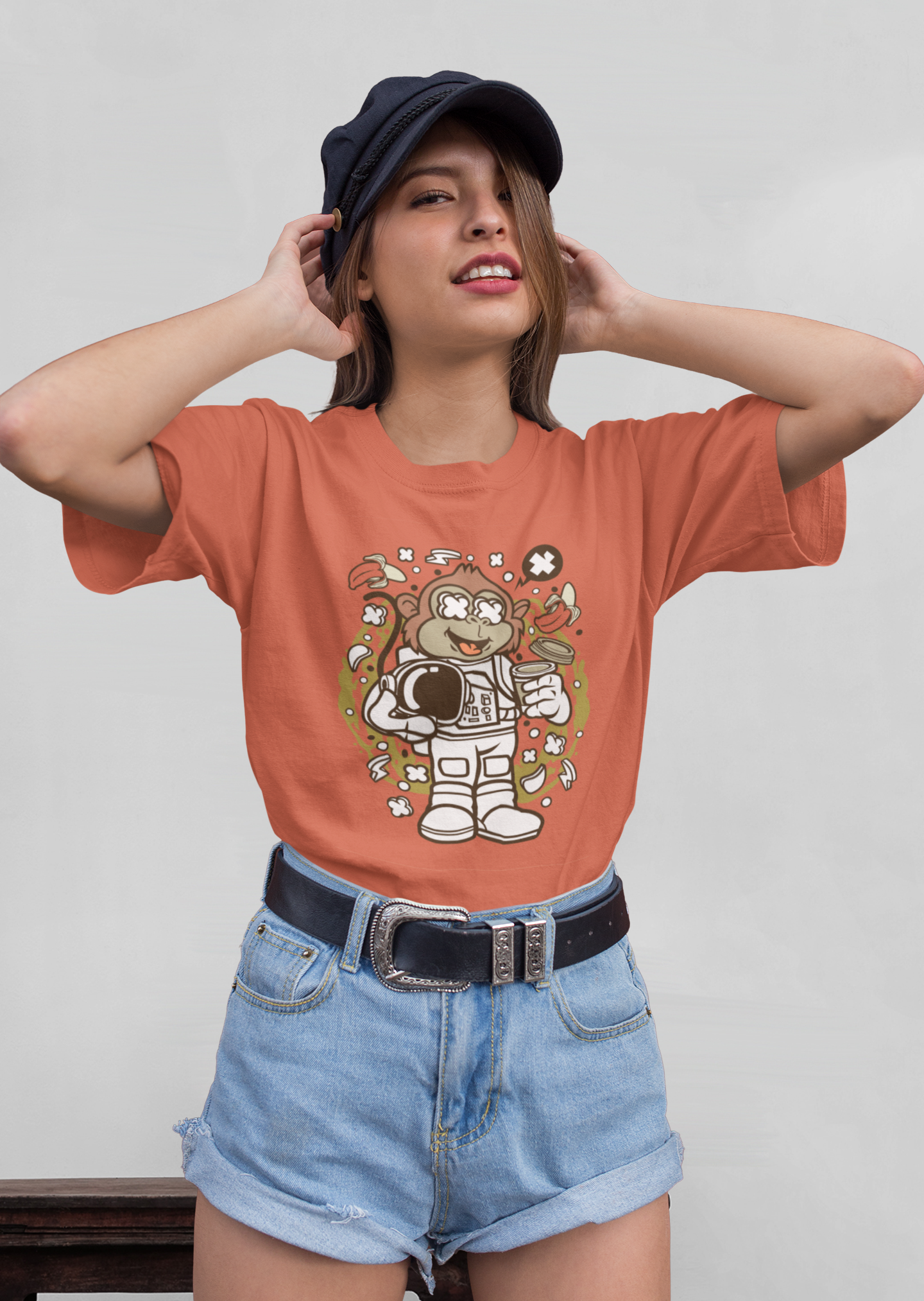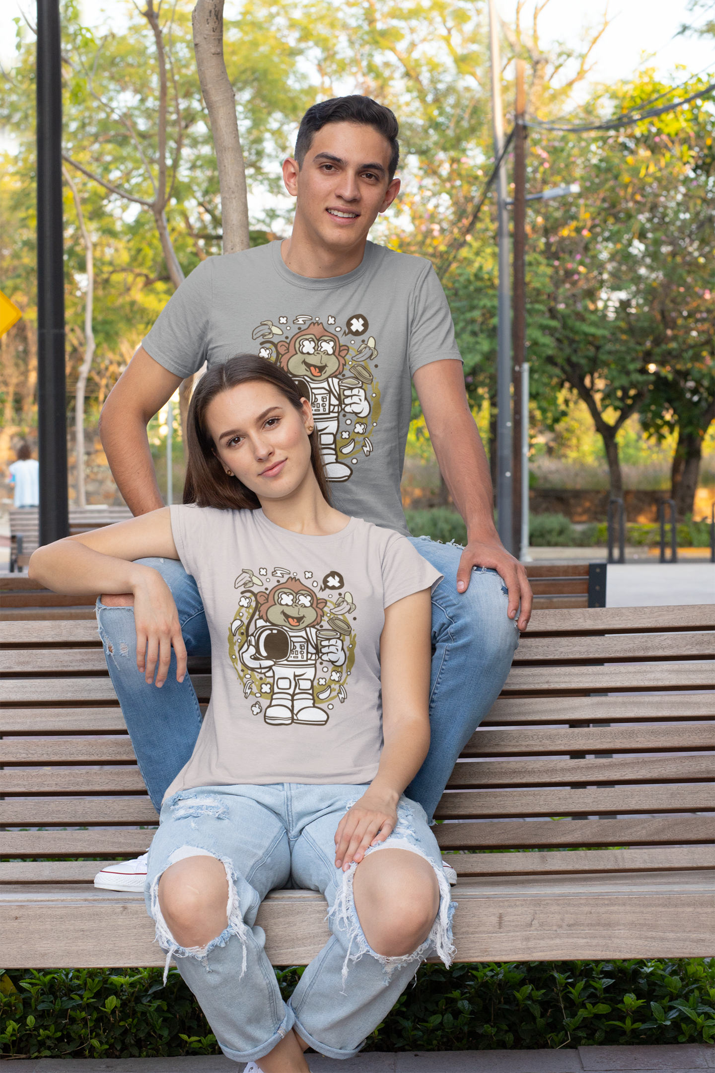 Unisex Erwachsenen Bio Baumwolle Kurzarm Shirt mit dem Design Cartoon Monkey Astronaut Front.