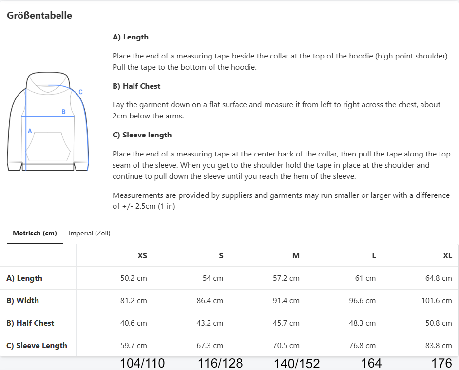 - Größentabelle: XS (104/110); S (116/128); M (140/152); L (164); XL (176)