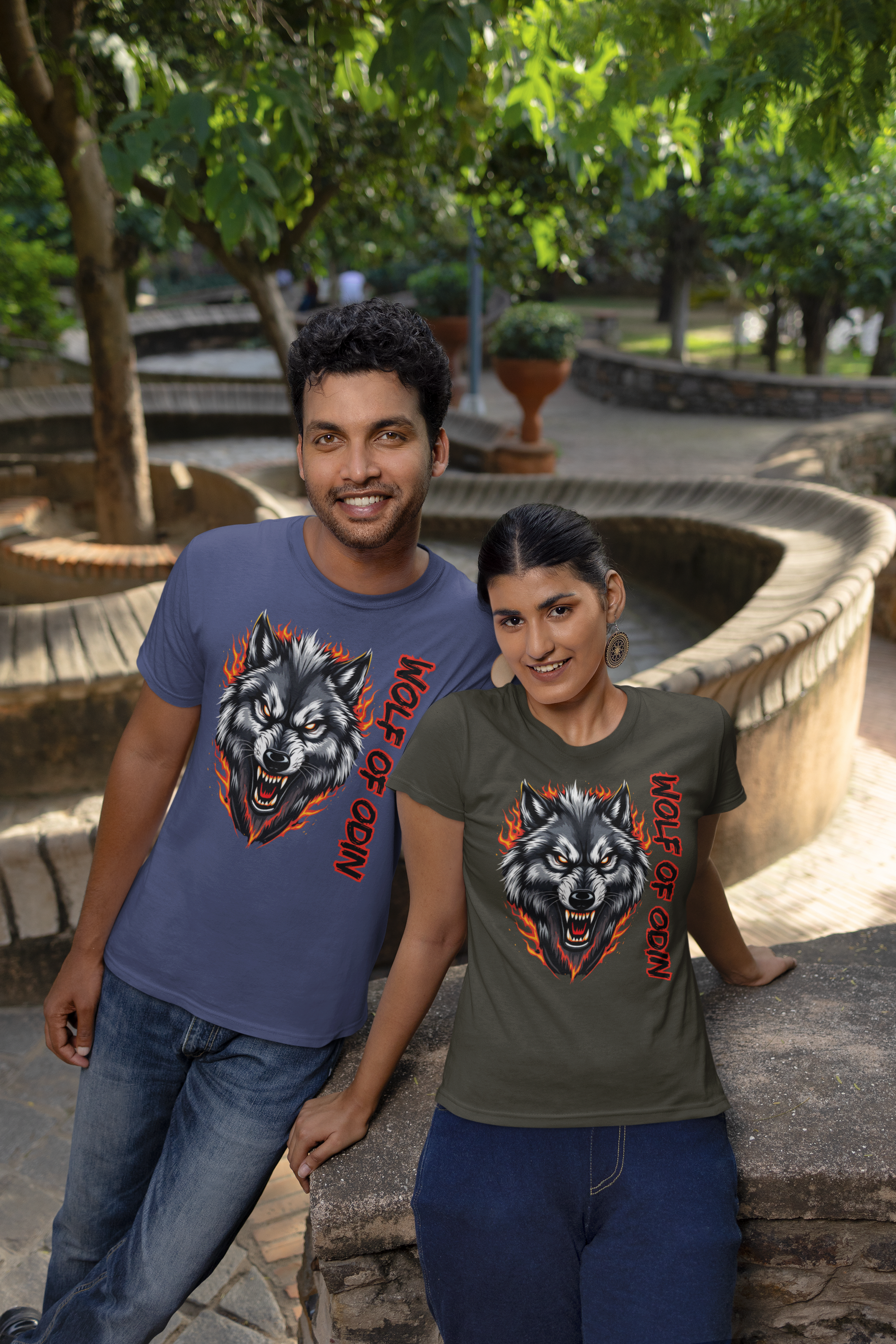 Unisex Erwachsenen Bio Baumwolle Kurzarm Shirt mit dem Design Wolf in Flammen Wolf of Odin.